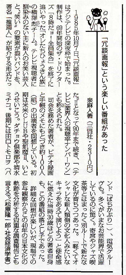 「今週の本棚」に『「冗談画報」という楽しい番組があった』(泉麻人)の書評が掲載されました。評者・松原隆一郎氏。
