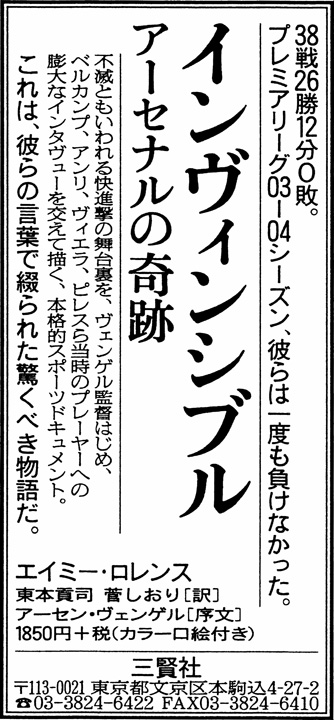 3月22日朝日新聞朝刊(北海道、九州は3月23日)に『インヴィンシブル アーセナルの奇跡』(エイミー・ロレンス アーセン・ヴェンゲル序文)の広告を掲載しました。